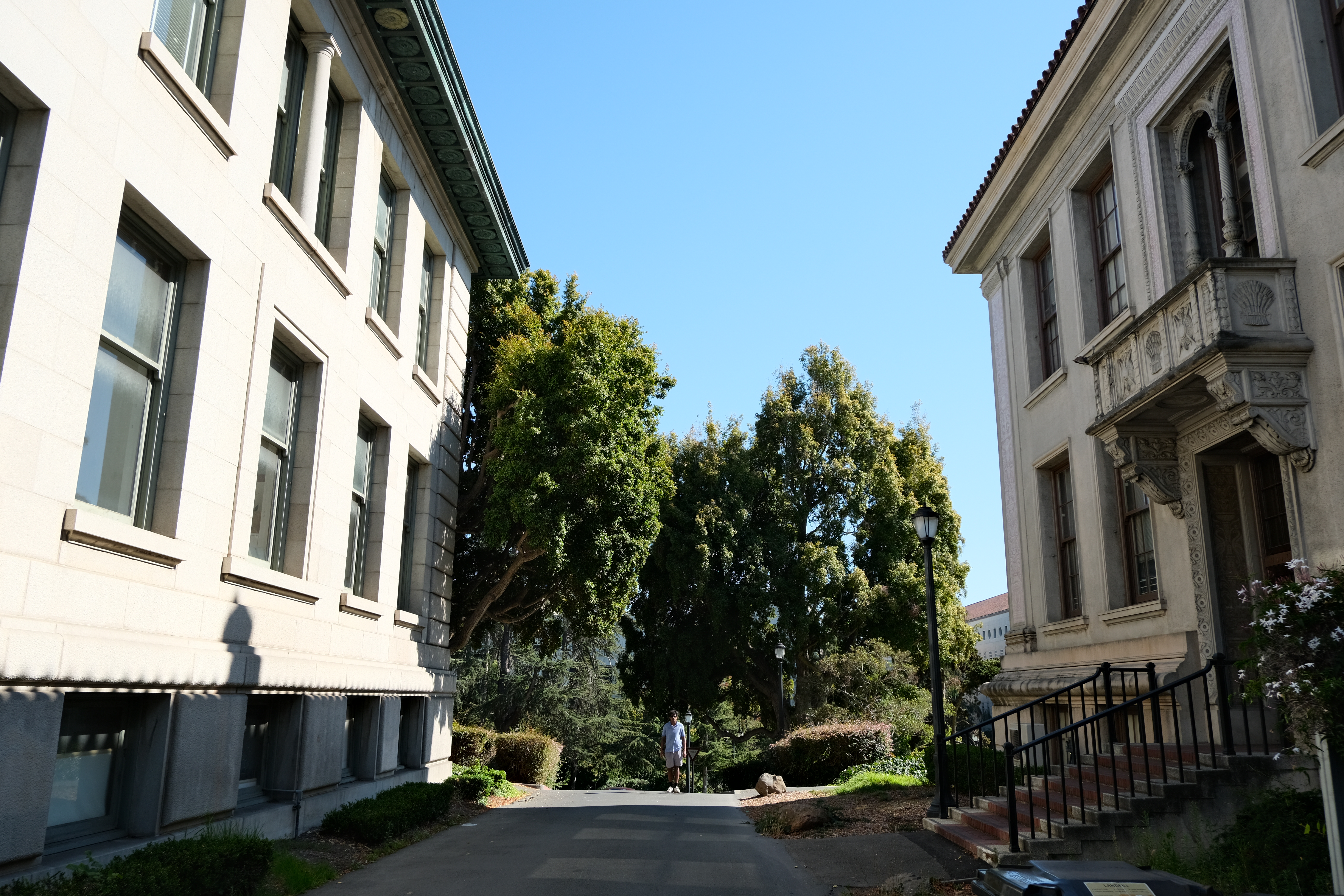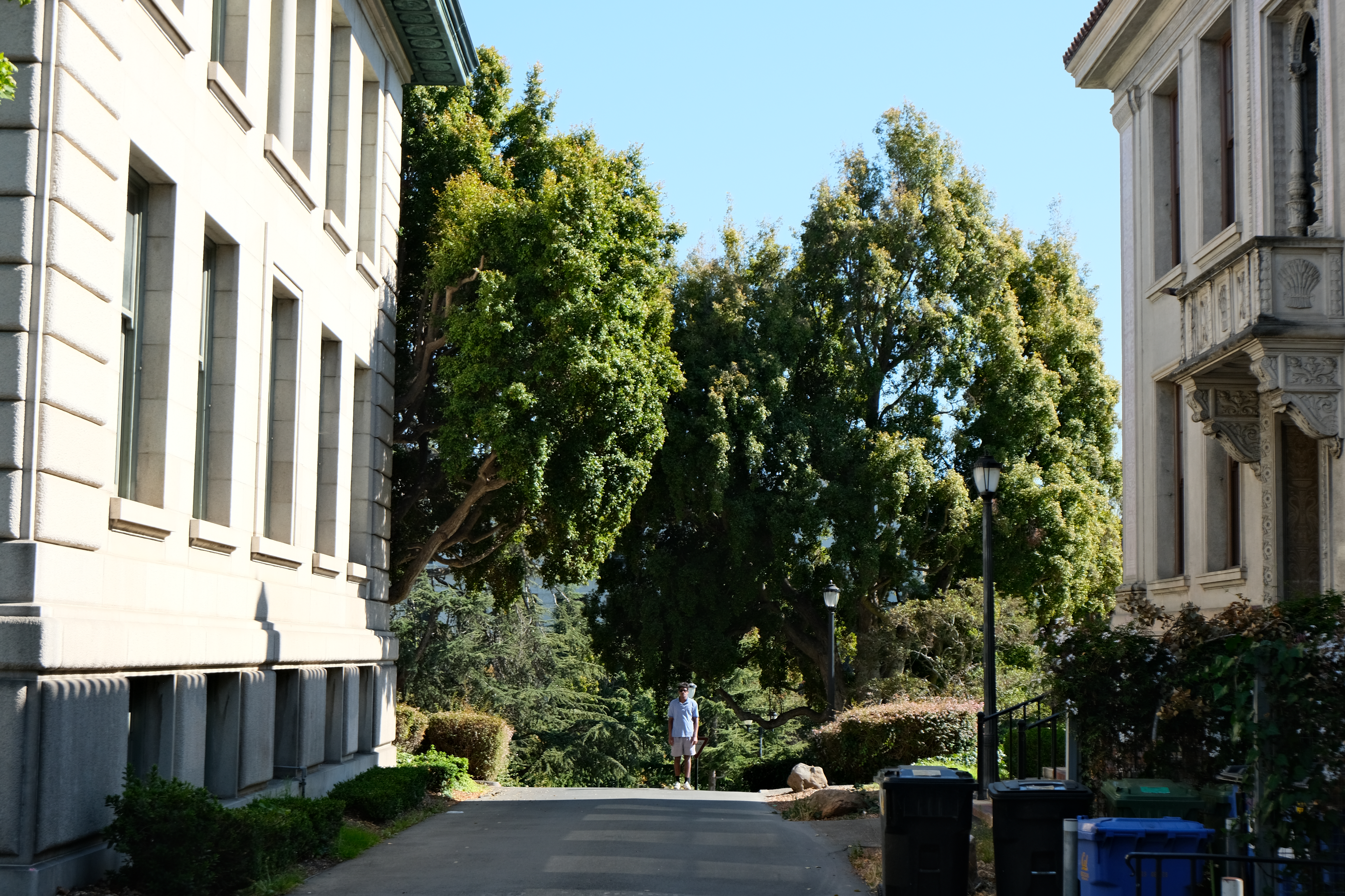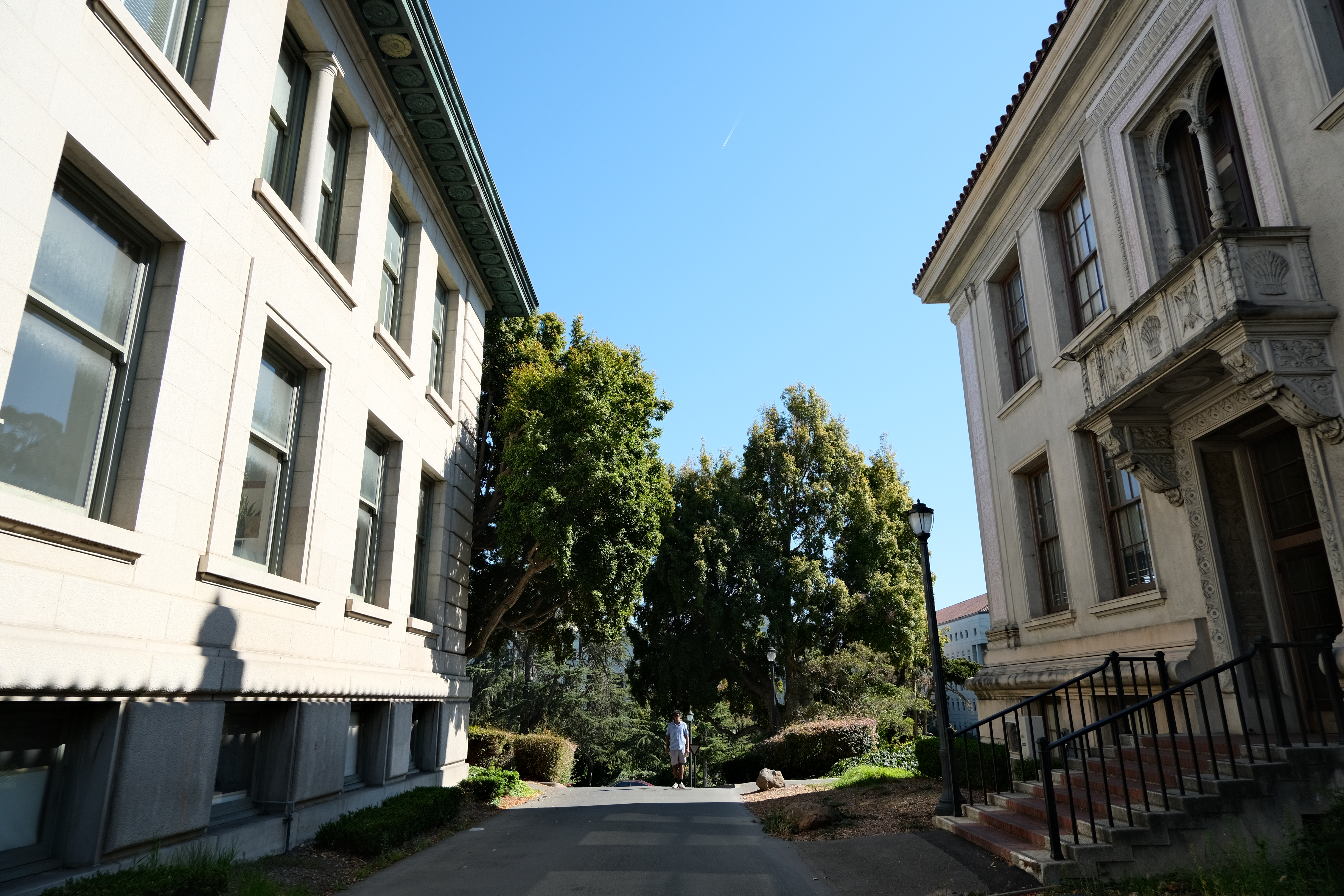 When you stand far away and zoom in down a street, the lens narrows its field of view. This compresses perspective: objects that are actually separated by large distances along the street appear stacked closely together, making the scene look flattened. Buildings, lampposts, and people at different depths seem almost the same size.