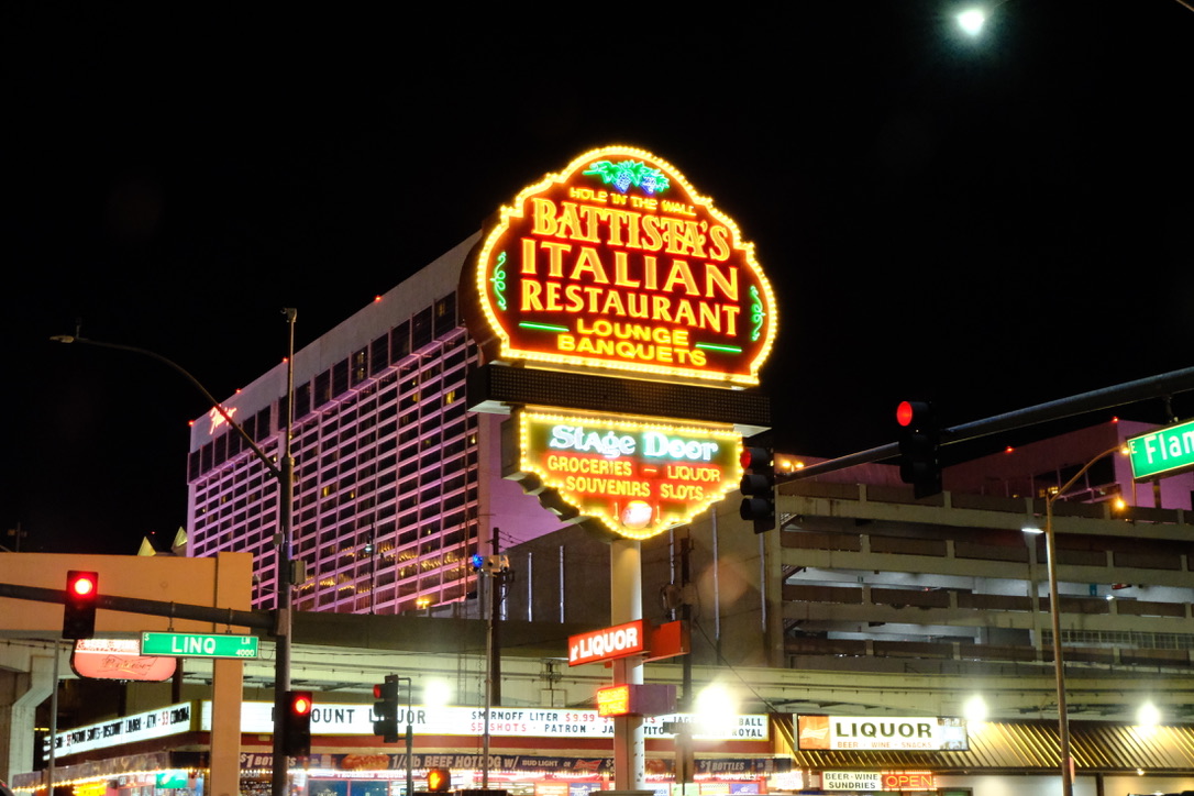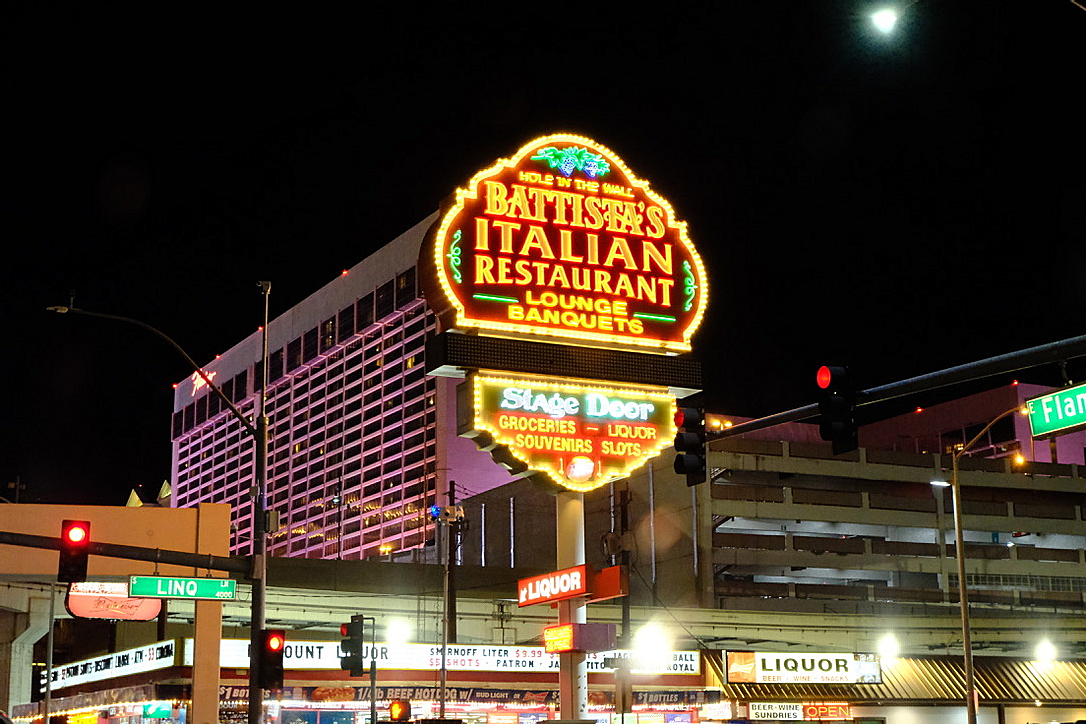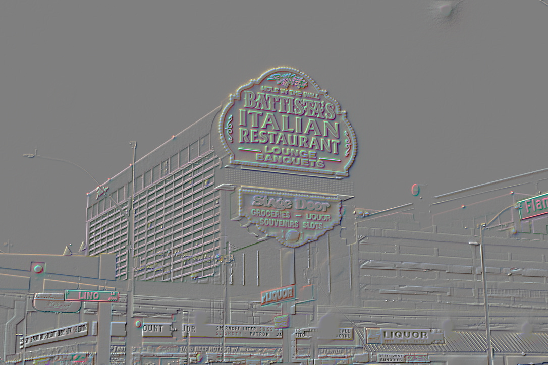 Left: High frequencies, Center: Original Las Vegas sign Right: Sharpened Las Vegas sign ($factor=1.2$).