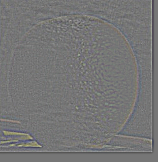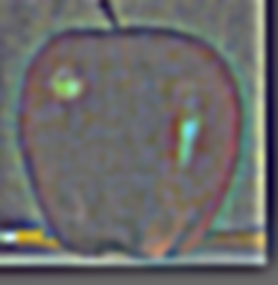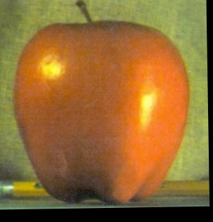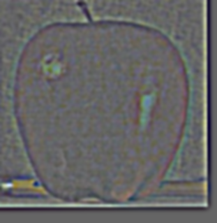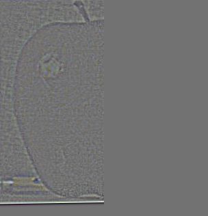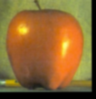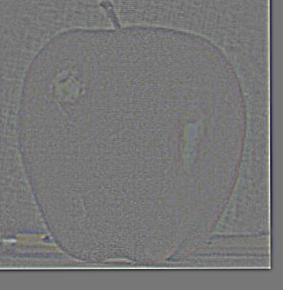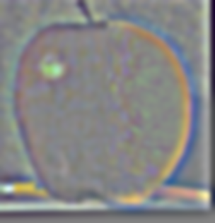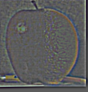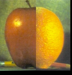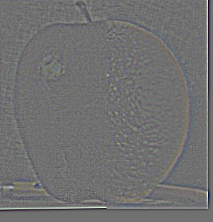 Applying the above vertical mask with increasing smoothing as we increase levels in the stack, we get the following level-by-level masked apples, oranges (using the inverse of the filter) and combined images.