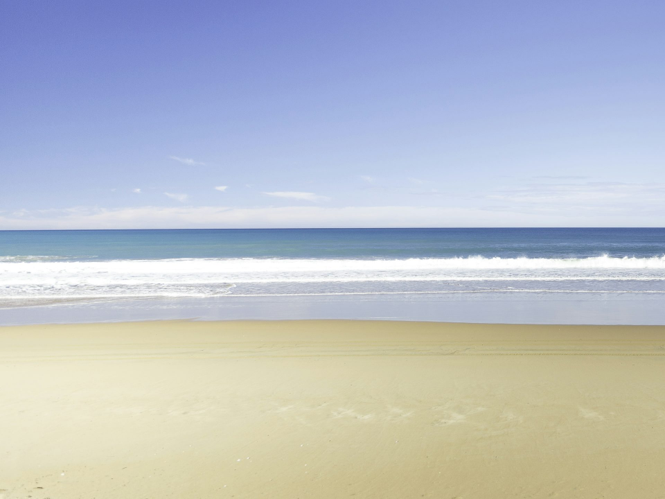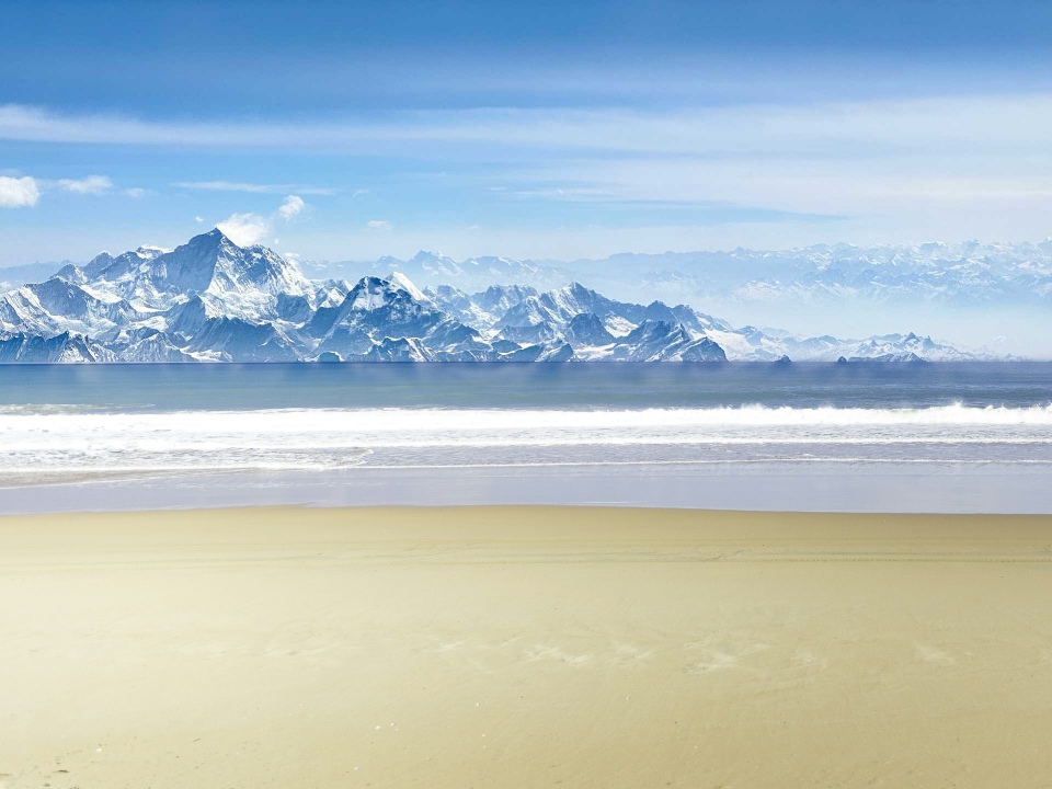Left: Image 1, mountains, Center: Image 2, a beach, Right: Horizontal mask applied.