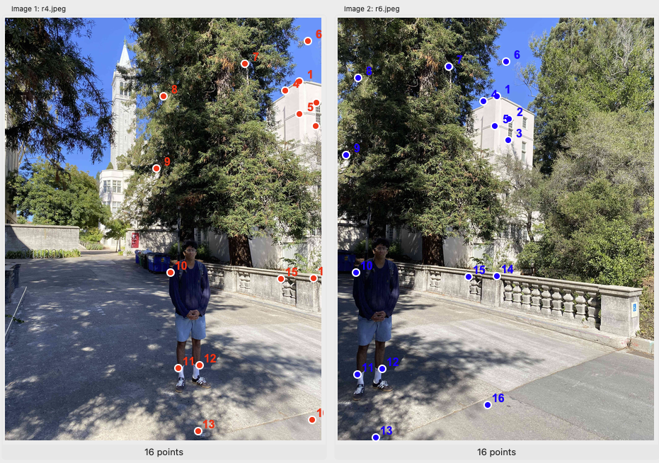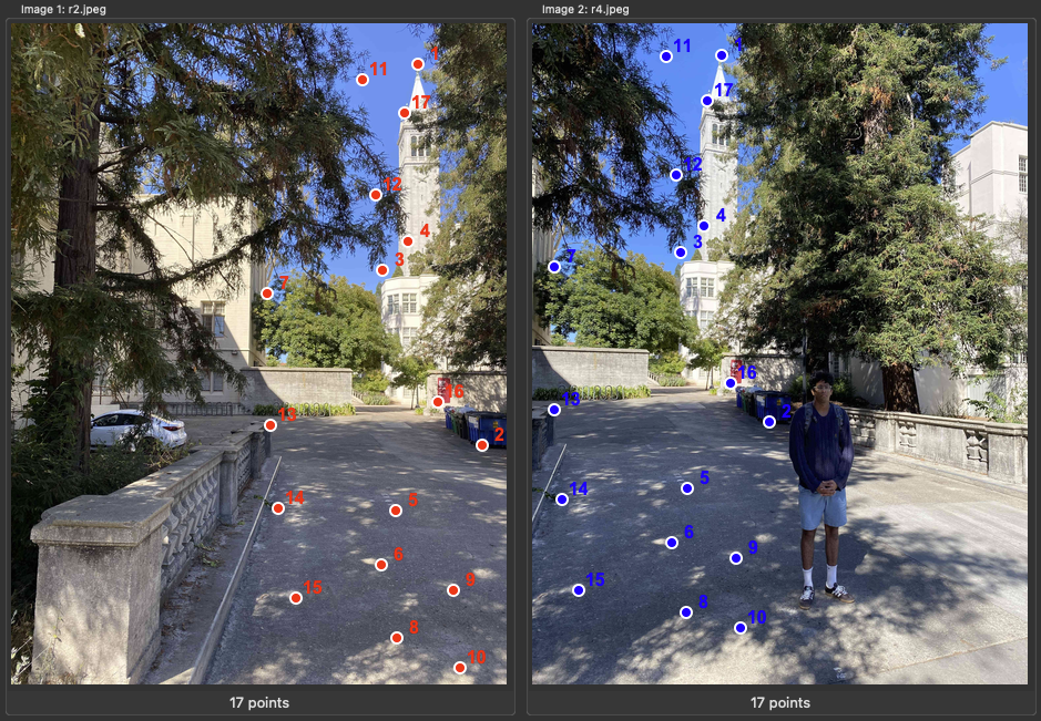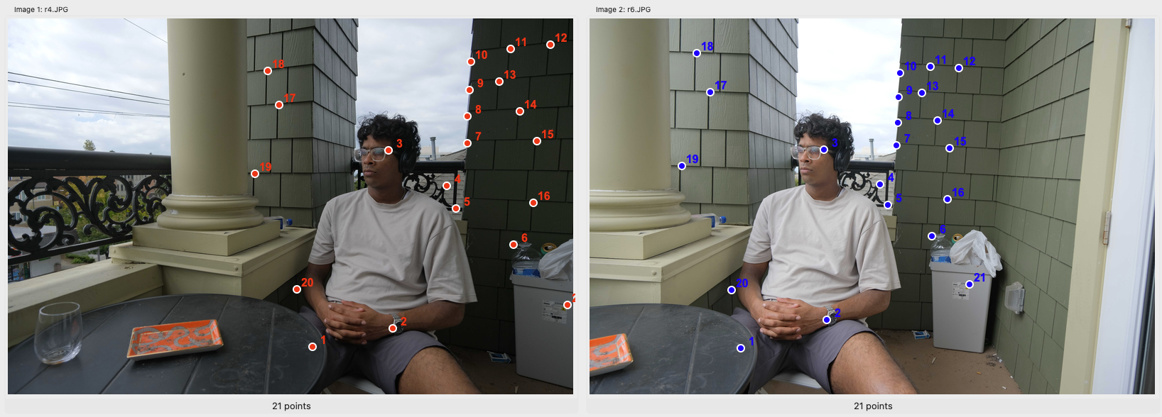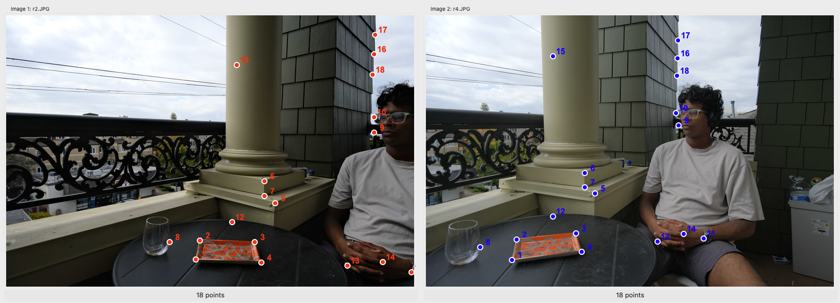 To establish point correspondences, I implemented a Tkinter interface to see to-be stitched photos side by side to find fitting reference points. The interface stores selections for each session in a JSON file. Here are some examples of my point correspondence selection. For stability, I aimed to get 15-20 pairs.